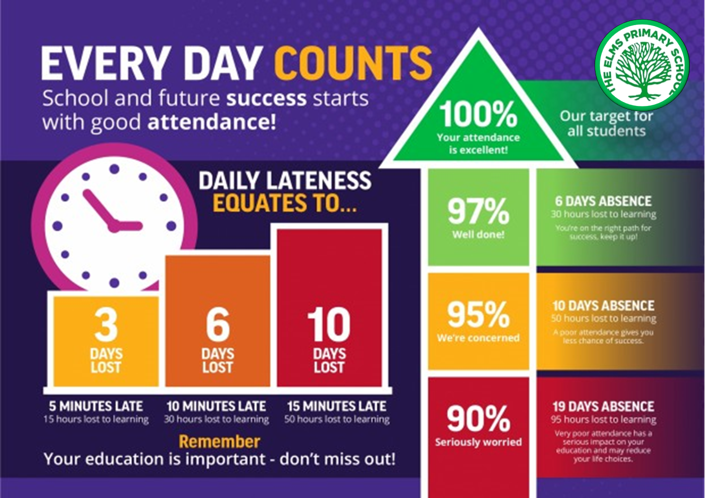 Regular and punctual school attendance is important. Pupils need to attend school regularly if they are to take full advantage of the educational opportunities available to them by law. The Elms Primary School fully recognises its responsibilities to ensure pupils are in school and on time, therefore having access to learning for the maximum number of days and hours.