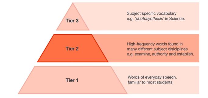 Throughout our curriculum (see here), we have identified the key words and vocabulary that we think are important to learn. Whilst our vocabulary grows the more we read, we also enhance the learning of new words with explicit vocabulary teaching. Sometimes these are subject-specific words (tier 3, see below), but also we teach tier 2 words, the language of an 'academic vocabulary'.