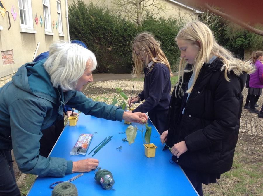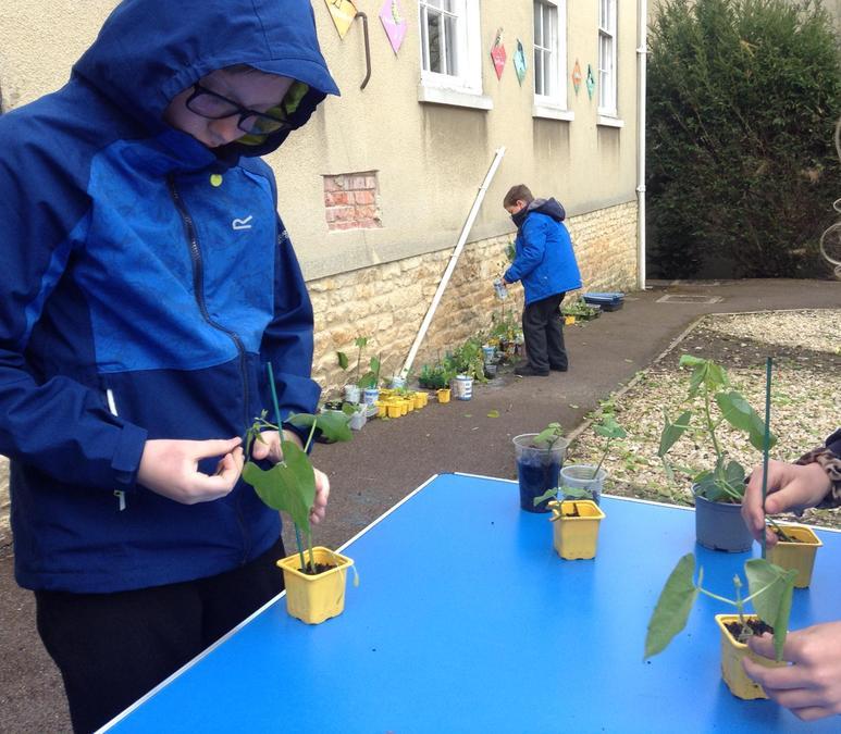 Our plants are growing well. Some of the beans, peas and sunflowers are so tall that we have tied the stems to sticks to support them.