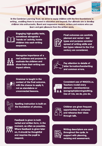 At The Elms, we are supported by the Cambrian Learning Trust English leads to support planning, delivery and implementation of our Writing Curriculum. As a school we follow the CLT 'Writing 10.'